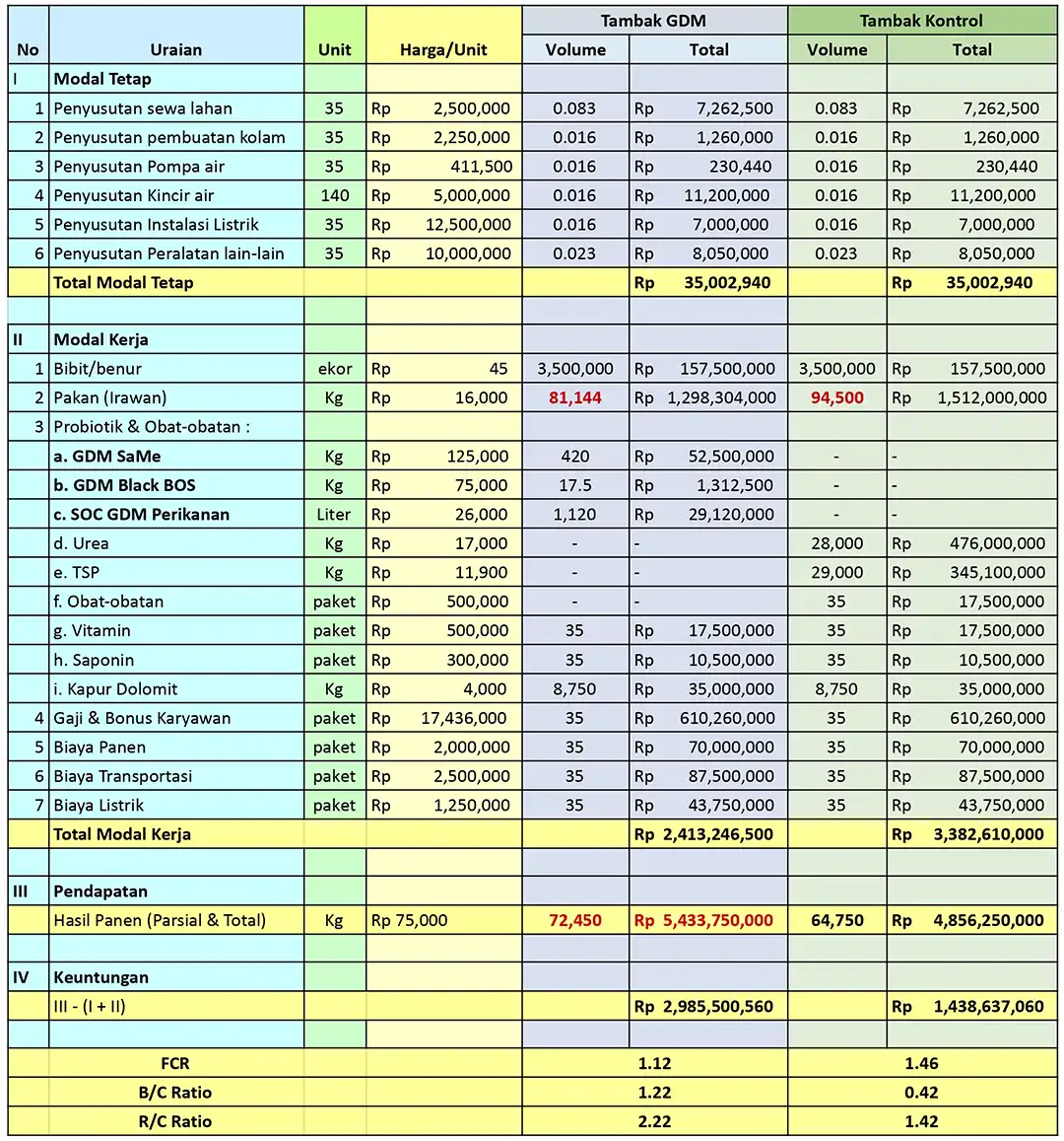 Biaya variabel pada lahan yang menggunakan probiotik udang vaname GDM terbukti lebih hemat, dengan selisih biaya Rp. 166.000.000. Sedangkan hasil panen pada lahan yang menggunakan produk GDM Organik berhasil mendapatkan hasil lebih besar, yaitu Rp.5.232.500.000.