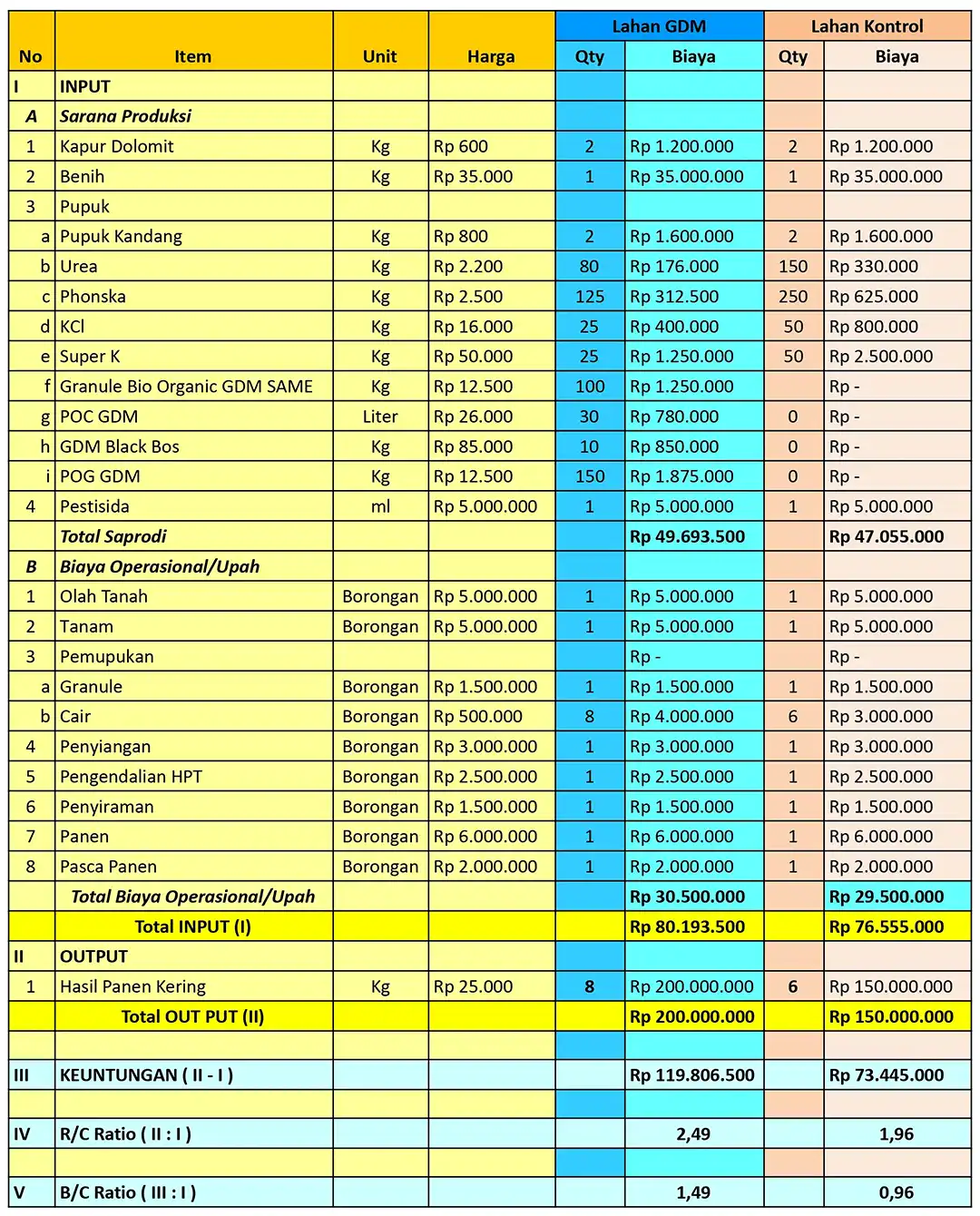 Berbeda dengan hasil panen pada lahan yang menggunakan Pupuk Organik Cair GDM Spesialis Pangan, pada lahan kontrol hanya bisa menghasilkan 1.800 kg, dengan harga jual seharga 15.000/kg, hanya mendapatkan hasil sebanyak Rp.27.000.000