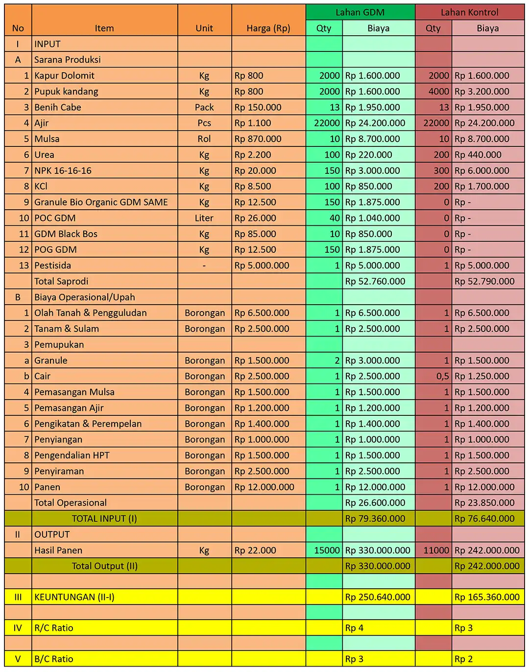 Berikut Adalah Perbandingan Analisa Usaha Budidaya Cabe yang Menggunakan Produk GDM Dengan Non GDM.