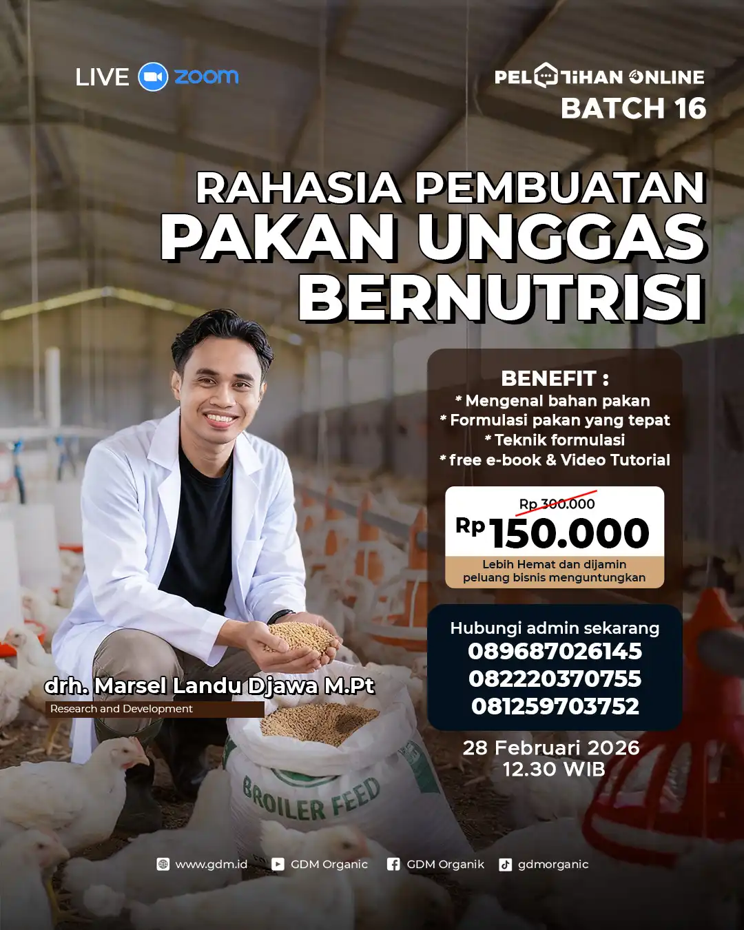 - Pilih Suplemen Organik Cair GDM Spesialis Peternakan yang merupakan suplemen organik dan mengandung mineral lengkap, multivitamin, dan bakteri baik. Sehingga ternak ayam kampung dapat lebih cepat besar dan bertelur. Selain itu, ternak yang diberikan produk ini juga menjadi lebih tahan terhadap serangan penyakit.